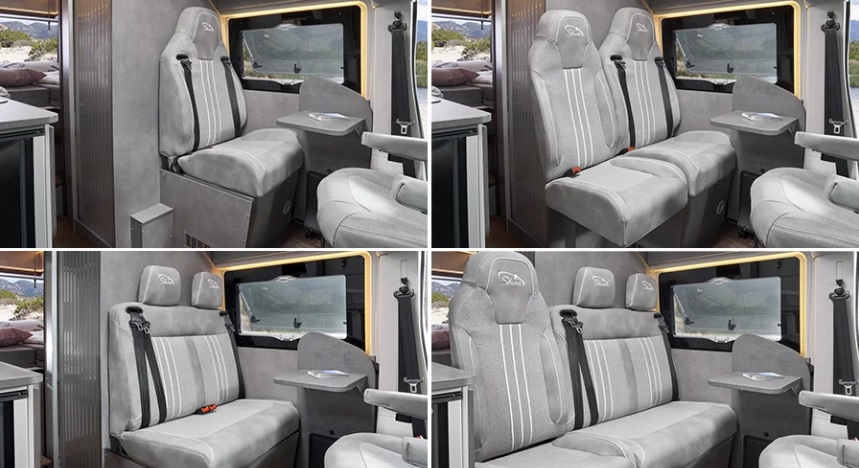 Oferujemy w przestrzeni pasażerskiej różne modele siedzeń, począwszy od tradycyjnej 2-osobowej kanapy, poprzez pojedyncze siedzenie lub siedzenia z możliwością podróżowania nawet do 5-ciu osób.